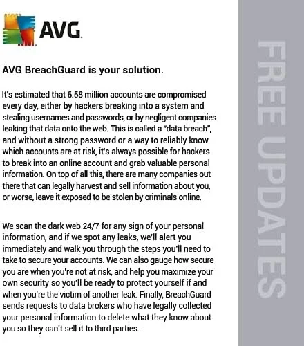 Your answer is AVG BreachGuard. We search the dark web around-the-clock for any indication of your personal data, and if we find any leaks, we’ll notify you right away and provide you with instructions on how to protect your accounts. In addition to helping you optimize your security so you’ll be prepared to defend yourself in the event of another leak, we can also assess your level of security while you’re not in danger. Lastly, BreachGuard recommends that data brokers that have lawfully obtained your personal information remove it from their records so that they are unable to sell it to outside parties.Minimum System Requirements: